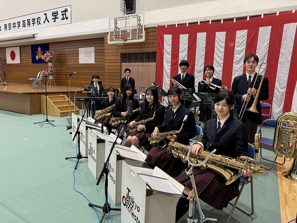 春雨となった4日土曜日には令和8年度の入学式が午前に高校生で午後からは中学生と1日で2回行われた。どちらの入学式でも吹奏楽部は式典演奏をさせて頂き式典前の演奏ではジャズを意識して甲子園バスの中で急遽追加されたDexterGordonの「CheesCake」とDisney名曲より「Beyond The Sea」と「The BareNecessities」の3曲をビッグバンド編成で演奏し、式典中には「君が代」をフルートやクラリネットにチューバを入れた吹奏楽編成で演奏した。新入生の前での演奏は初めてのジャズの経験となる可能性も大きいので不備があっていけないと卒業生の引退で欠けたピアノのベースには補助の卒業生に助けて頂き懐かしい響きのする演奏となった。ご協力をいただきました先輩方ありがとうございました。そして、本日から帝京高校での生活の始まる新入生諸君には今後の活動をパワーアップするためにも多くの入部を音楽室で部員一同心よりお待ちしている。来週13日月曜日の部活動紹介後14日火曜日の放課後には音楽室で新入生歓迎演奏会を計画している。気になる新入生は先ずは音楽室へ!皆さんのご来場をお待ちしている。