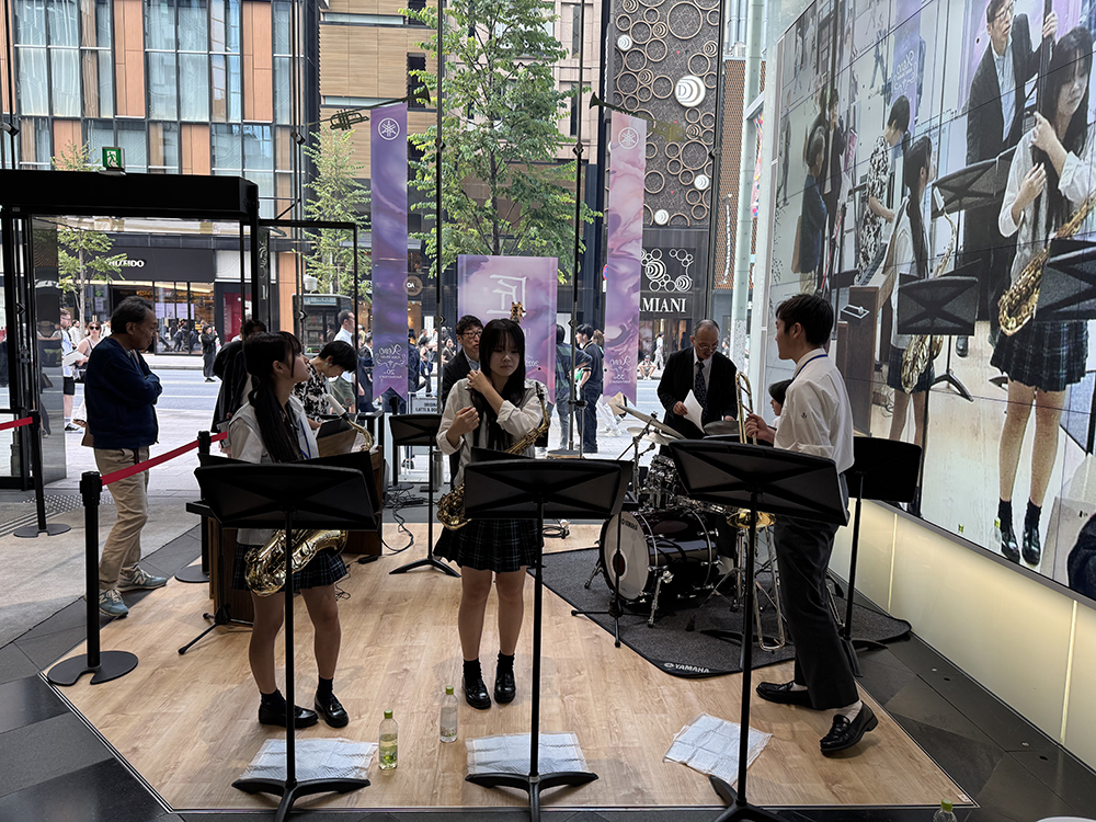 気持ちの良い秋晴れに恵まれた12日日曜日、海外からの人々をはじめ多くの人々が行き交う銀座歩行者天国にあるヤマハ銀座店様でのスチューデントジャズステージinGINZAに参加をさせていただいた。午前中には日本を代表するジャズプレイヤーのピアノ守屋純子先生とベース中村健吾先生にドラム高橋徹先生のクリニックを受講してから、午後より店頭の特設ステージで先生方に演奏のフォローをしていただきながら参加生徒達は思う存分演奏を楽しんだ。また同じく参加した千葉県富里高校様との交流も有意義に過ごしたようである。海外からのお客様も多く、お越しいただきました皆様に心より感謝を申し上げます。生徒達は中間考査前の忙しい時期ではありましたがたくさんの貴重な経験ができたようである。火曜日から中間考査が始まるため、ステージが終わるとすぐに帰宅して勉強に励んだようである。中間考査が終わるといよいよ秋の応援シーズンが始まる。すでに準備は始まっているが野球部やサッカー部の健闘に期待をしたい。皆様のご声援をよろしくお願い申し上げます。